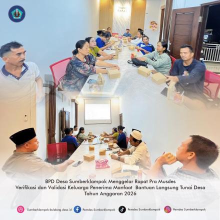 Badan Permusyawaratan Desa (BPD) Desa Sumberklampok menggelar rapat pra Musyawarah Desa (Pra Musdes) Verifikasi dan Validasi (Verval) Keluarga Penerima Manfaat (KPM) Bantuan Langsung Tunai (BLT) Desa Tahun Anggaran 2026 pada hari Senin, 26 Januari 2026. Rapat ini berlangsung di Ruang Rapat Lantai II Kantor Perbekel Sumberklampok dan dihadiri oleh Perbekel Sumberklampok, Ketua dan Anggota BPD, Perangkat Desa, serta LPM Desa Sumberklampok.