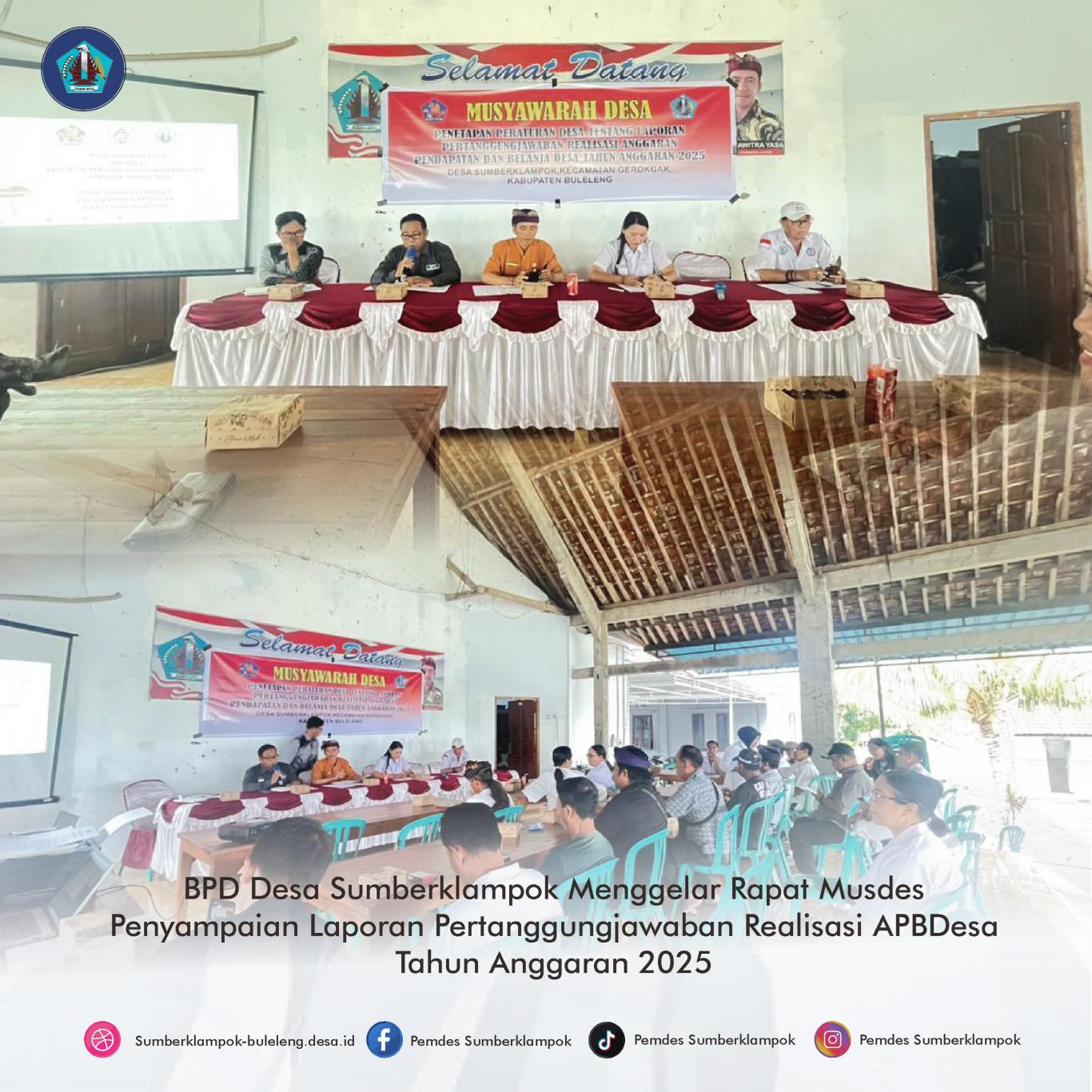 Badan Permusyawaratan Desa (BPD) Desa Sumberklampok menggelar rapat Musyawarah Desa (Musdes) tentang Penyampaian Laporan Pertanggungjawaban Laporan Realisasi Anggaran Pendapatan dan Belanja Desa (APBDesa) Tahun Anggaran 2025 pada hari Rabu, 28 Januari 2026. Kegiatan ini berlangsung di Aula Kantor Perbekel Sumberklampok dan dihadiri oleh Camat Gerokgak yang diwakili oleh Staf Kasi Pemerintahan, Pendamping Desa/PLD, Perbekel Sumberklampok, BPD, Perangkat Desa, LPM, RT, PKK, Kelian Desa Adat, BUMDesa, KDM, Kelian Banjar Adat, serta para tokoh masyarakat Desa Sumberklampok.