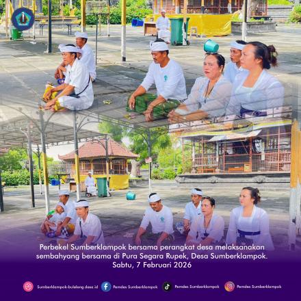 Perbekel Sumberklampok bersama perangkat desa melaksanakan sembahyang bersama di Pura Segara Rupek, Desa Sumberklampok, pada Sabtu, 7 Februari 2026, dalam rangka merayakan Tumpek Uye/Tumpek Kandang. Persembahyangan ini merupakan wujud rasa syukur sekaligus pengamalan nilai-nilai ajaran Hindu yang menekankan cinta kasih yang tulus dan besar kepada seluruh ciptaan Tuhan, tidak hanya kepada sesama manusia, tetapi juga kepada binatang, tumbuhan, serta alam semesta beserta isinya.