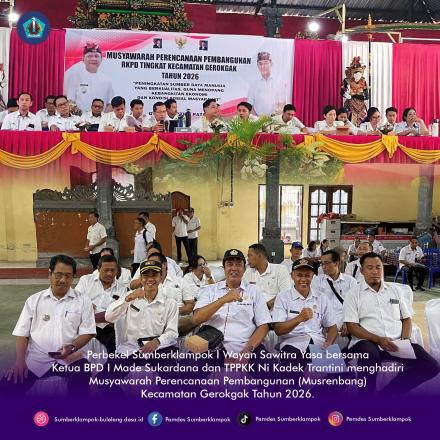 Rabu, 11 Februari 2026, Perbekel Sumberklampok I Wayan Sawitra Yasa bersama Ketua BPD I Made Sukardana dan TPPKK Ni Kadek Trantini menghadiri Musyawarah Perencanaan Pembangunan (Musrenbang) Kecamatan Gerokgak Tahun 2026. Kegiatan ini dipimpin langsung oleh Camat Gerokgak I Gd Arya Rimbawa Giri, S.IP., M.AP., serta dihadiri oleh staf kecamatan, SKPD terkait, seluruh perbekel se-Kecamatan Gerokgak beserta perangkat desa dan undangan lainnya.