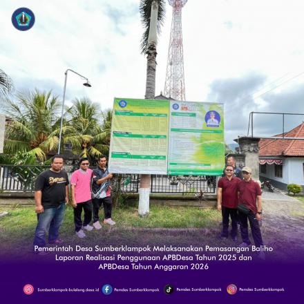 Pemerintah Desa Sumberklampok melaksanakan pemasangan baliho Laporan Realisasi Penggunaan APBDesa Tahun 2025 dan APBDesa Tahun Anggaran 2026 pada hari Kamis, 19 Februari 2026. Baliho tersebut dipasang di tempat-tempat strategis, yaitu di Halaman Gedung Posyandu Banjar Dinas Tegal Bunder, Halaman Kantor Perbekel Sumberklampok, Halaman Gedung Posyandu Banjar Dinas Sumberbatok, serta Halaman Banjar Adat Teluk Terima. Pemasangan ini bertujuan agar informasi terkait pengelolaan keuangan desa dapat diakses dengan mudah oleh seluruh masyarakat.