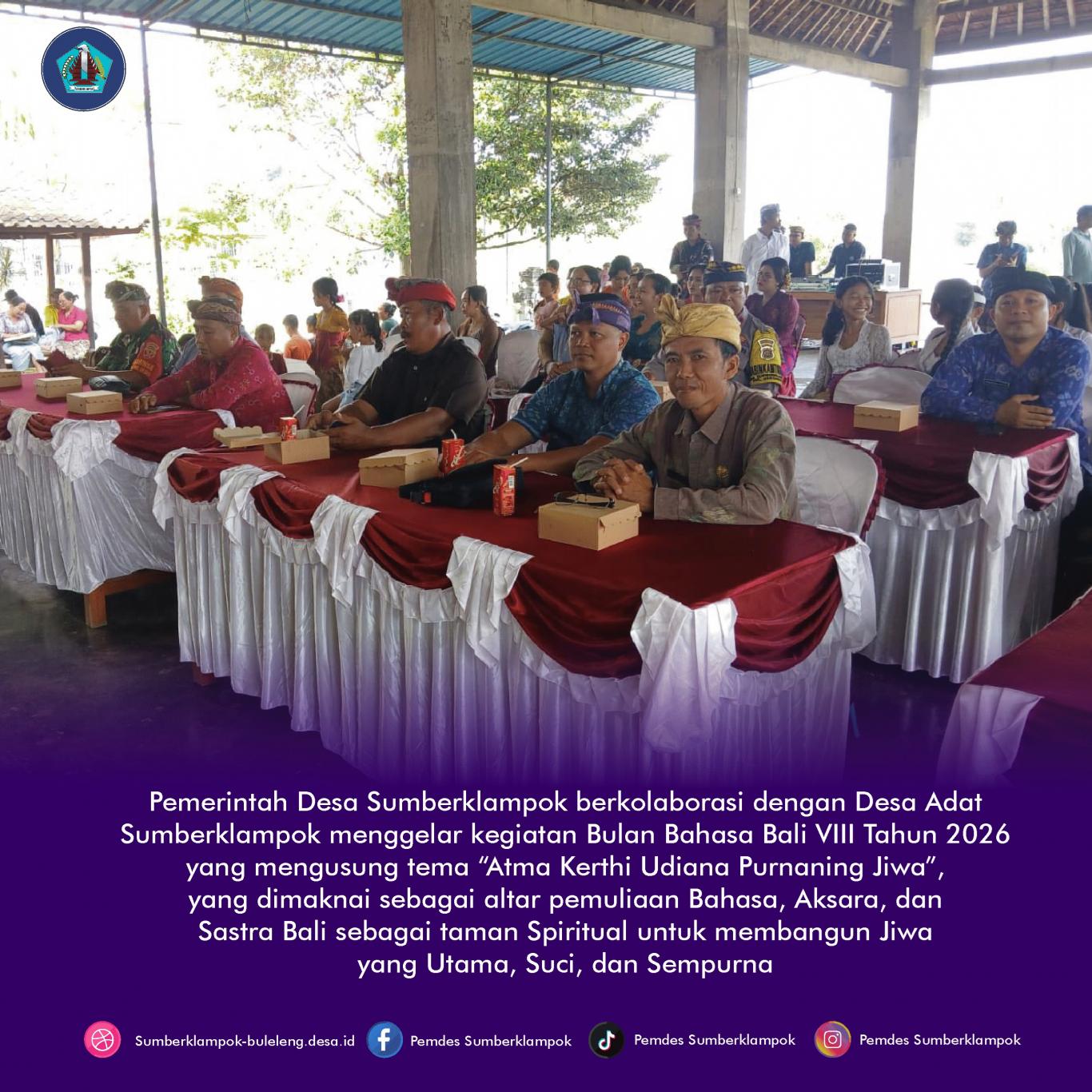 Pemerintah Desa Sumberklampok berkolaborasi dengan Desa Adat Sumberklampok menggelar kegiatan Bulan Bahasa Bali VIII Tahun 2026 yang mengusung tema “Atma Kerthi – Udiana Purnaning Jiwa”, yang dimaknai sebagai altar pemuliaan Bahasa, Aksara, dan Sastra Bali sebagai taman Spiritual untuk membangun Jiwa yang utama, Suci, dan Sempurna. Kegiatan ini dilaksanakan pada hari Jumat, 20 Februari 2026, bertempat di Aula Kantor Perbekel Sumberklampok, Kecamatan Gerokgak. Acara tersebut dihadiri oleh Camat Gerokgak yang diwakili oleh Kasi Sosial dan Budaya, Perbekel Sumberklampok beserta Perangkat Desa, Ketua BPD, PKK, Kelian Desa Adat beserta prajuru, para juri, serta para peserta lomba.