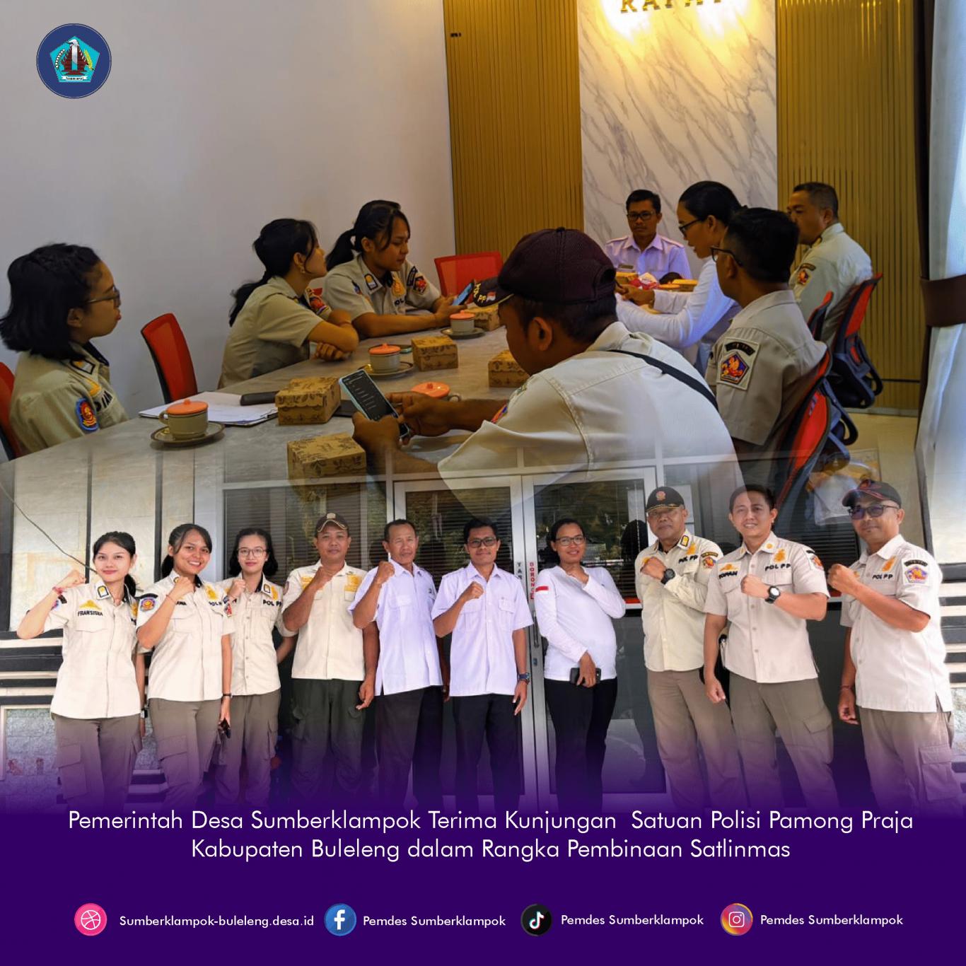Pemerintah Desa Sumberklampok menerima kunjungan dari Satuan Polisi Pamong Praja Kabupaten Buleleng pada Rabu, 4 Maret 2026. Kunjungan tersebut diterima oleh Sekretaris Desa bersama Kasi Pemerintahan di ruang rapat lantai II Kantor Perbekel Sumberklampok. Kegiatan ini merupakan bagian dari pelaksanaan pembinaan serta penguatan Satuan Perlindungan Masyarakat (Satlinmas) di wilayah Kabupaten Buleleng guna meningkatkan kapasitas dan kesiapsiagaan anggota di tingkat desa.