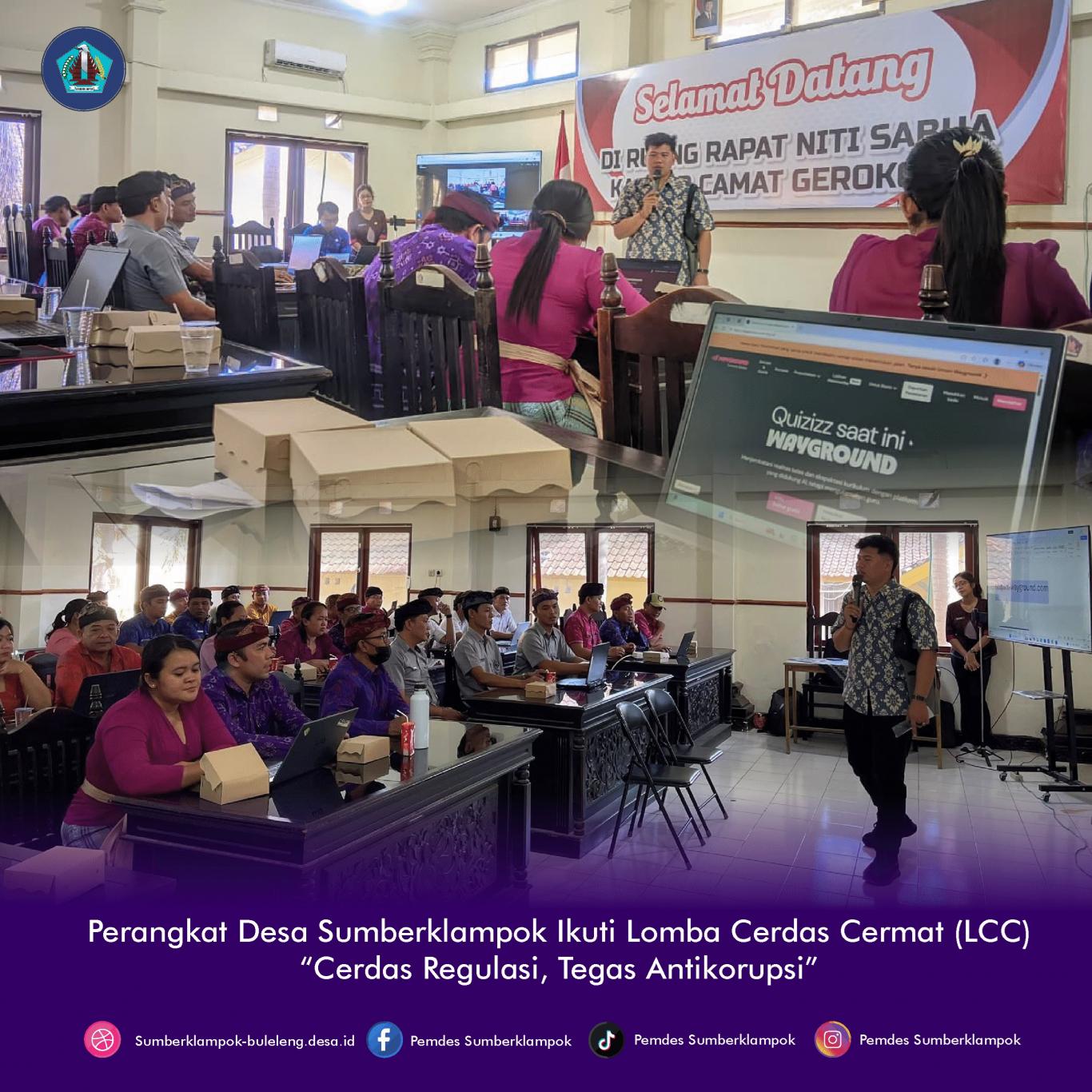 Perbekel Sumberklampok I Wayan Sawitra Yasa menugaskan Sekretaris Desa Haerus Zaman, Kaur Perencanaan I Putu Adi Eka Putra, dan Kaur Keuangan Ni Ketut Wirati untuk mengikuti Lomba Cerdas Cermat (LCC) yang diselenggarakan oleh Inspektorat Kabupaten Buleleng dengan tema “Cerdas Regulasi, Tegas Antikorupsi.” Kegiatan tersebut dilaksanakan pada Kamis, 12 Maret 2026 di Ruang Rapat Niti Sabha Kantor Camat Gerokgak. Lomba ini merupakan bagian dari rangkaian peringatan HUT Kota Singaraja ke-422.